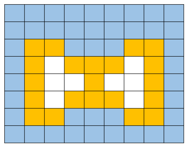예를 들어 아래와 같이 치즈가 배치되어 있습니다. 우선 외부 공기가 들어있는 빈 칸을 탐색합니다. BFS를 이용해도 되고 DFS를 이용해도 됩니다.