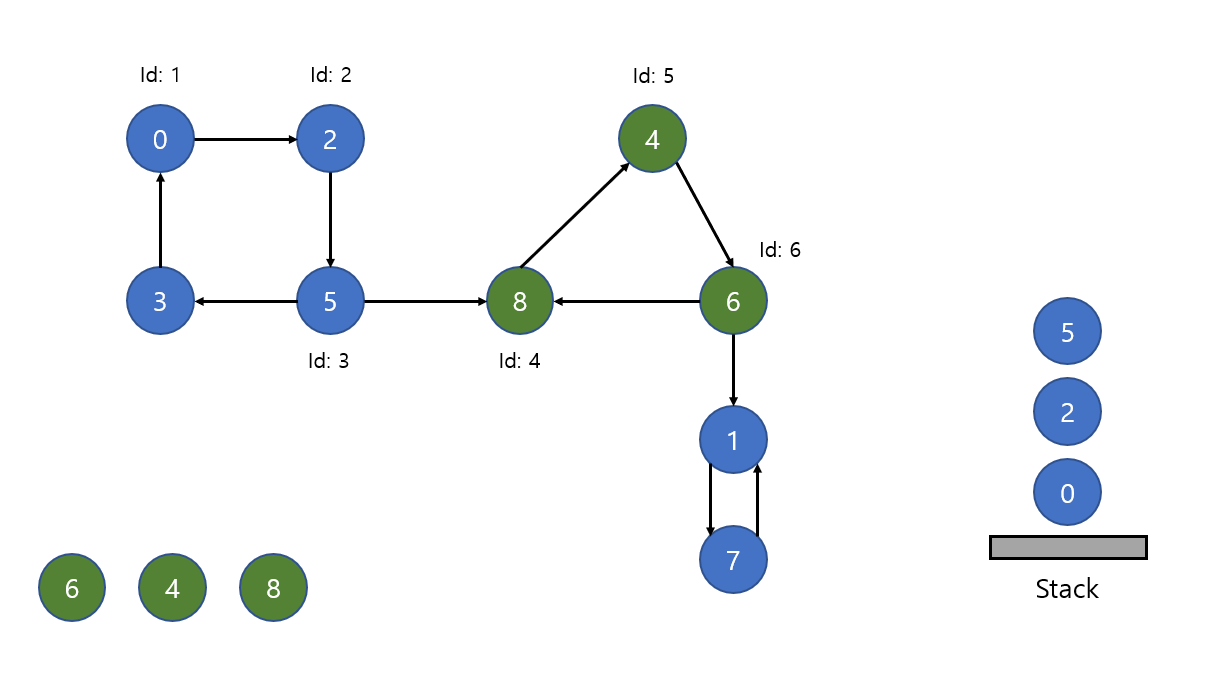 0을 방문했습니다. 방문한 0을 stack에 집어넣고 0에 고유 id를 생성합니다. 이 고유 아이디는 다른 노드를 방문하면 id값을 올려서 방문한 노드에 추가합니다.