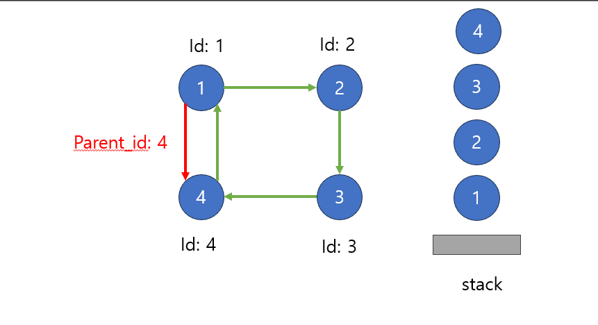 위의 그림 처럼 1 -> 2 -> 3 -> 4 순으로 탐색했다고 가정합니다. 4위치에서는 0은 사이클로 판단을 했기 때문에 0의 아이디 값인 1을 리턴합니다. 위로 올라가 3에서도 _scc(4)가 1을 리턴했기 때문에 parent = min(3, 1) = 1이 됩니다. 마찬가지로 2에서도 마찬가지로 parent=1이 됩니다. 이렇게 거슬러 올라가 _scc(1)로 다시 도착하게 됩니다.
