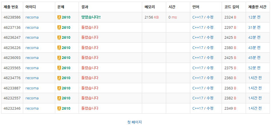 분명히 맞게 짰는데 하도 틀려서 왜그런가 하고 봤더니 visited를 초기화를 하지 않았습니다. 그동안 파이썬만 계속 쓰다가 OpenCV공부하려고 C++을 3년만에 복귀하고 아직 C++ 문법을 적응 못하고 있습니다. 파이썬은 별도 처리 없이 배열을 그냥 list comprehension으로 초기화 하면 되니깐요.