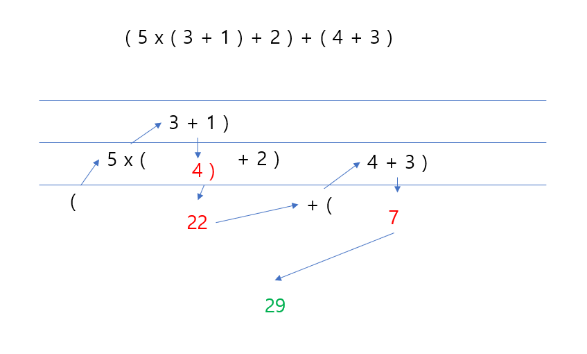 괄호가 없으면 이정도 알고리즘만해도 충분히 풀 수 있지만, 여기서는 괄호가 추가됩니다.